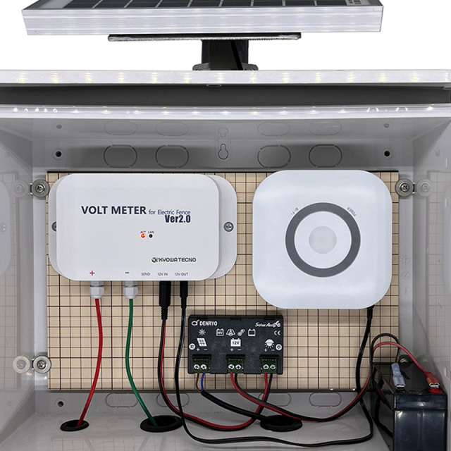 【セット内容】 エフモスジュニア電柵電圧計Ver2.0本体、アース棒、メインボックス(鍵、固定バンド付き)、ソーラーパネル5W、充電コントローラー、密閉型小型12Vバッテリー、LTEルーター、SIM カード、バッテリー接続コード、EfMoS IDシール、取扱説明書