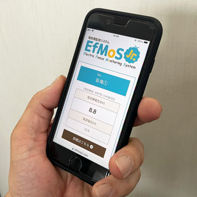 エフモスジュニアは電気柵の電圧をいつでもWEB上で確認できるため、現地へ行く手間を省き、